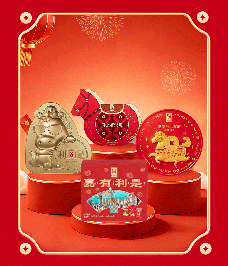 在99年经典传承之上,嘉顿紧扣“骐骥送福”的马年寓意,推出多款代言人佘诗曼同款CNY新年礼盒,让国民记忆中的美味与新春祝福深度绑定。礼盒设计暗藏生意洞察:马年限定主题礼盒推出「马上有钱」「马上发财」「马上有鸿运」三款精美罐装产品,融入金马、红马生肖元素,精准击中年节送礼的仪式感需求。
